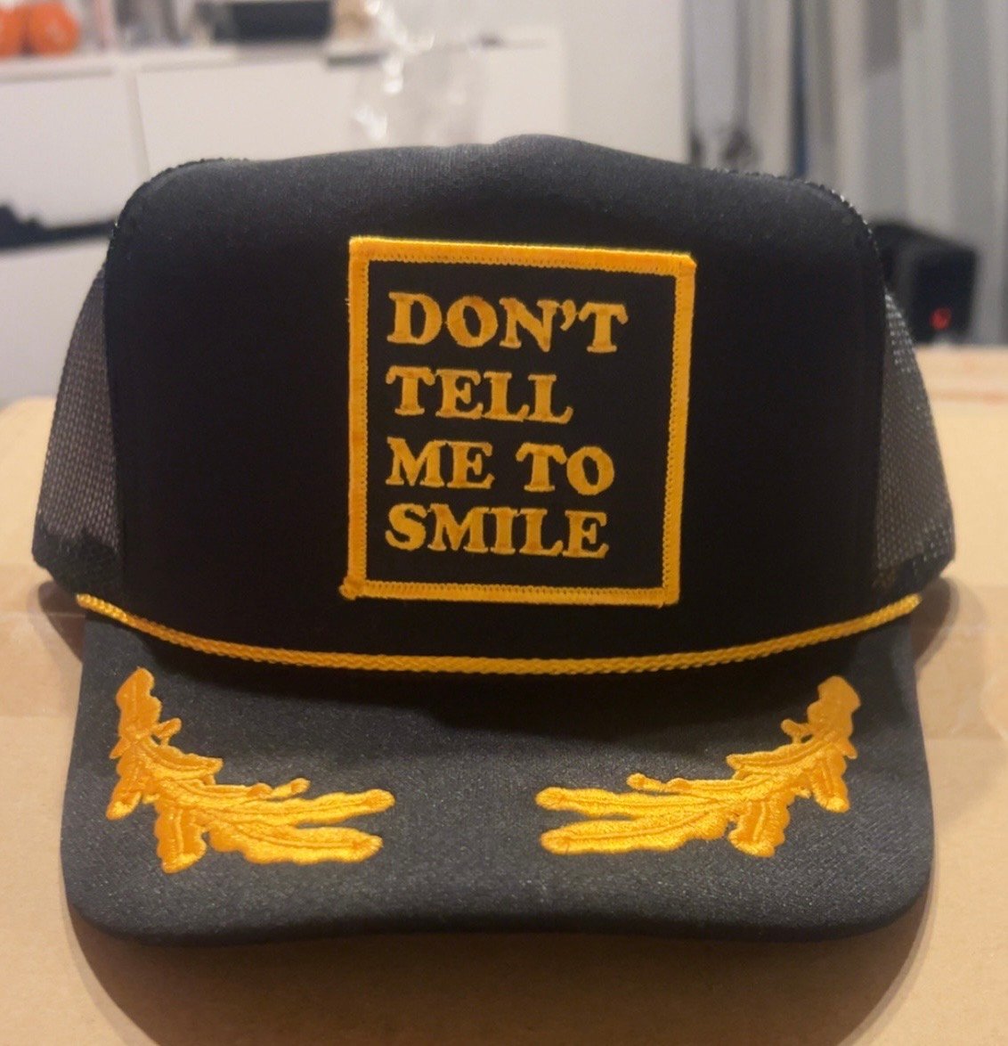 Tell them where to shove it perfect for working customer service. Otto brand captain’s hat with embroidered don’t tell me to smile patch.
